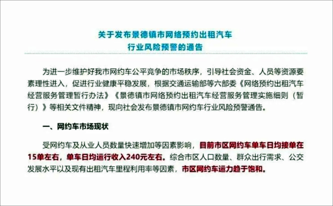 一周前,江西景德镇市交通运输局发布了风险预警通告,指出受网约车及从业人员数量快速增加等因素影响,市区网约车单车日均接单约15单,日均运行收入240元左右。