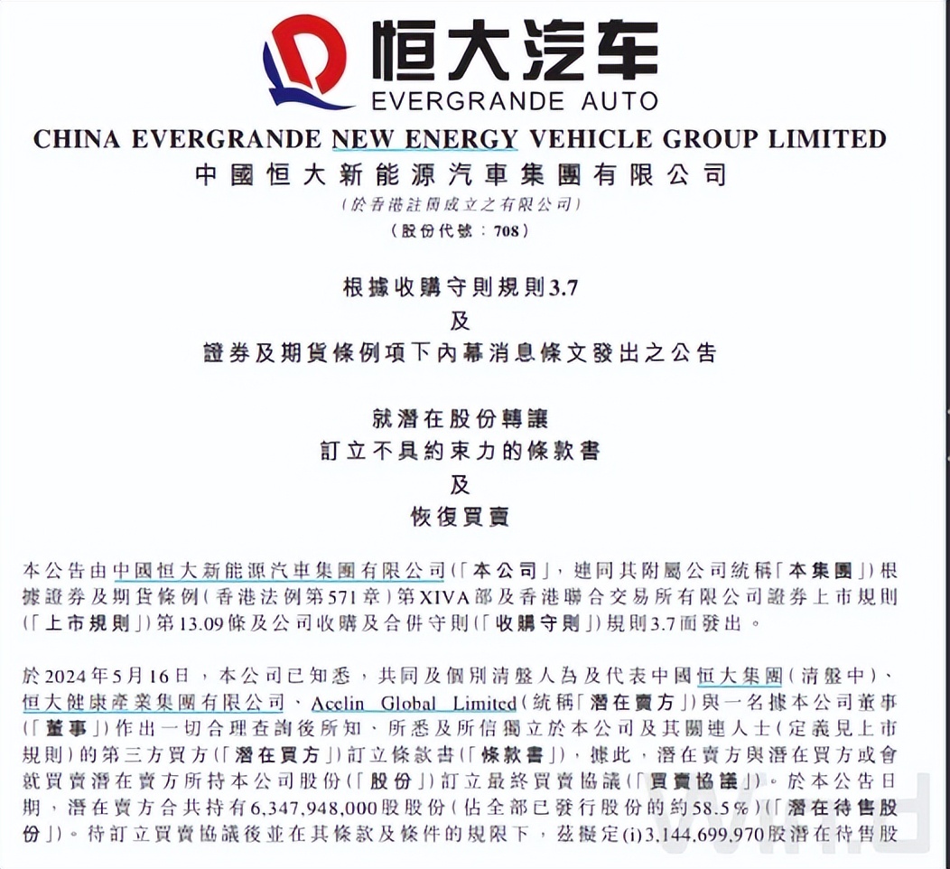 5月26日晚,恒大汽车发布公告,一个神秘的第三方公司,愿意出资购买31.45亿股恒大集团股份,这部分股份约占公司已发行股份的29%。同时该公司还愿意提供信贷额度,支持集团的继续运营和电动汽车业务的发展,并且在将来考虑继续收购32.03亿约占29.5%的股份。