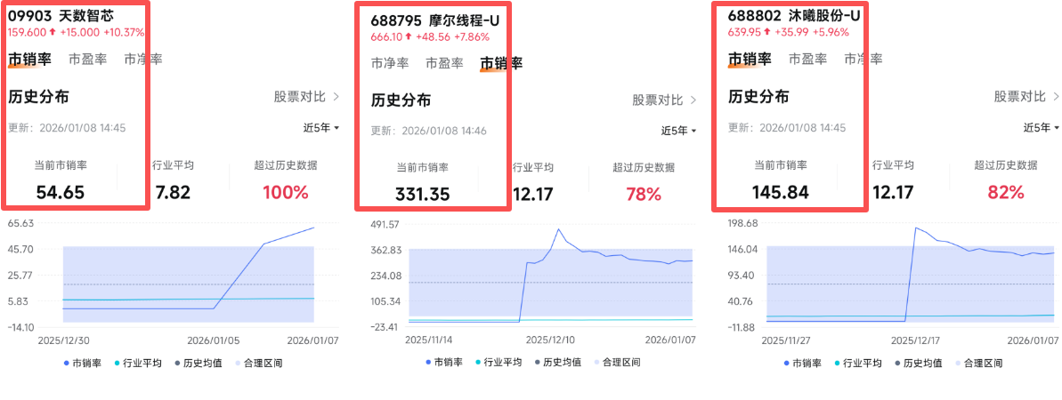 图:截至2026年1月8日15时,天数智芯、摩尔线程、沐曦市销率(PS)