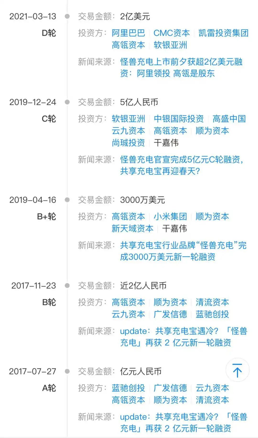 天眼查显示,在IPO之前,怪兽充电进行过6轮融资,仅成立当年,怪兽充电就获得了三轮融资,累计融资规模超过20亿元。资方包括小米、阿里巴巴、软银中国、顺位资本、高瓴创投等知名企业和机构。