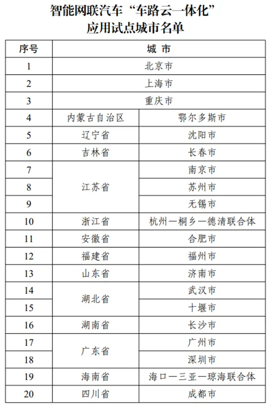 2024年7月,工业和信息化部、交通运输部等五部委发布《关于公布智能网联汽车“车路云一体化”应用试点城市名单的通知》,确定了20个城市(联合体)为应用试点城市。