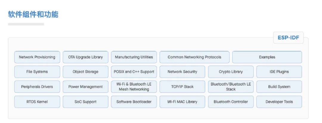 功能丰富的软件组件:ESP-IDF 集成了大量的软件组件,包括 RTOS、外设驱动程序、网络栈、多种协议实现技术以及常见应用程序的使用助手。它提供了典型应用程序所需的大部分构建块,用户在开发应用时只需专注于业务逻辑即可。ESP-IDF 不仅具有免费开源的开发工具,还支持 Eclipse 和 VSCode 等 IDE,确保其易于开发人员使用。