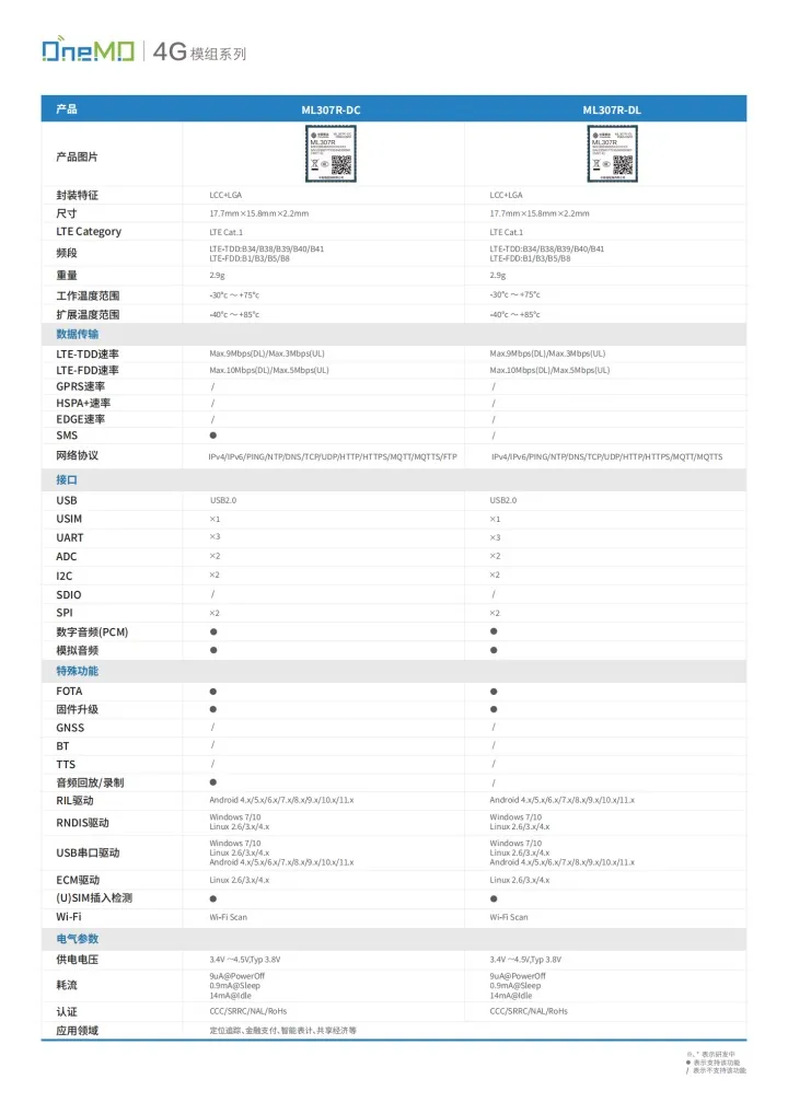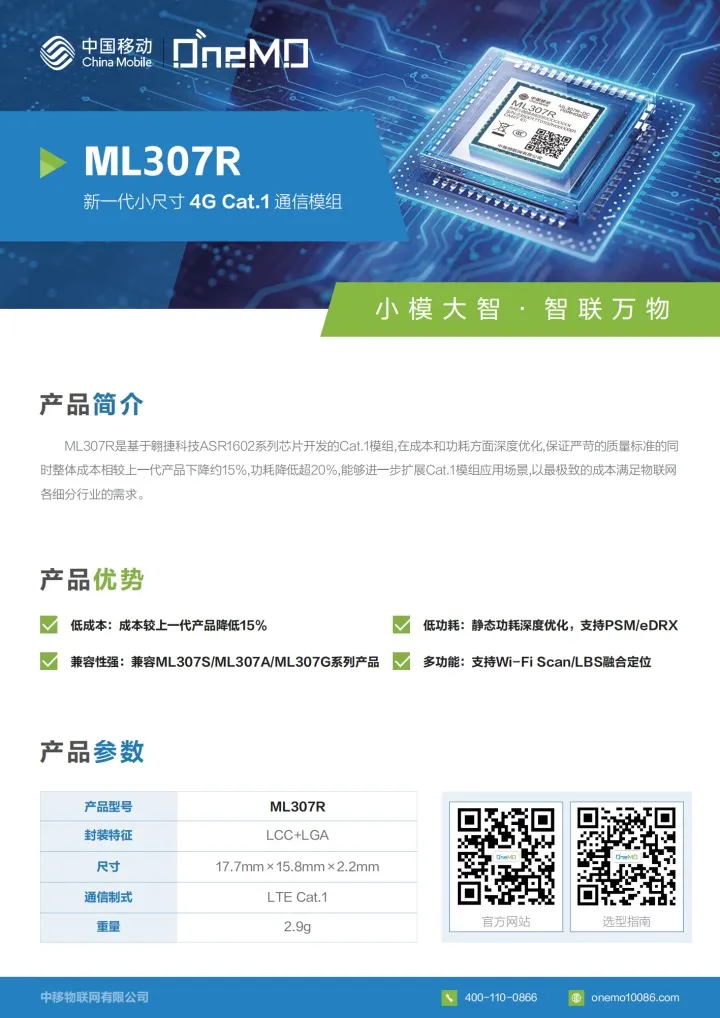 ML307R 是基于翱捷科技 ASR1602 系列芯片开发的 Cat.1 模组,在成本和功耗方面深度优化,保证严苛的质量标准的同时整体成本相较上一代产品下降约 15%,功耗降低超 20%,能够进一步扩展 Cat.1 模组应用场景,以最极致的成本满足物联网各细分行业的需求。