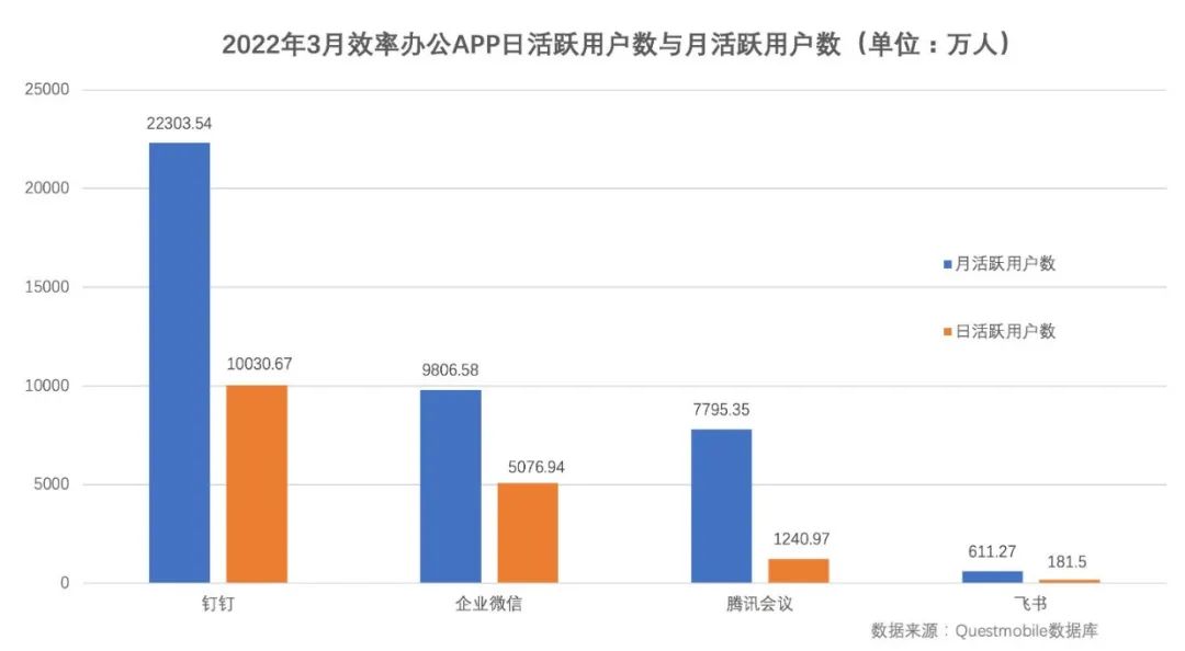 附带说一句,按照用户基数排名,现在的钉钉已经成为整个“阿里系”仅次于淘宝、支付宝和高德地图的第四大APP;它也很可能是中国互联网历史上第一个DAU过亿的To B应用。根据QuestMobile的统计,钉钉的DAU大约是企业微信的2倍、飞书的55倍,在办公协同市场的领先优势十分明显。