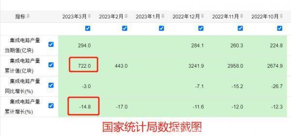 数据显示,2023年3月份,国内集成电路生产量为294亿颗,同比减少3%。而2023年1-3月份累计生产集成电路722亿颗,同比减少14.8%。