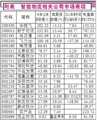 记者也注意到,仓储物流行业触网有着天然的优势,庞大的客户资源及数据是转型电商及供应链金融的强力支撑。目前被爆炒的仓储物流公司均是触网转型或有新模式的公司,如华鹏飞、新宁物流、怡亚通、飞力达、瑞茂通等。其中,华鹏飞1月27日公告13.5亿元并购了博韩伟业后股价连拉8个涨停板,今年以来涨幅高达202%,公司表示,博韩伟业的平台整合与运营经验将助力上市公司打造融合现代物流业产业基础及运营服务。怡亚通是智能物流公司中2014年度业绩增长最好的公司,公司实现净利润3.16亿元,同比增长57.63%。在移动互联网迅速发展和全球供应链一体化的大背景下,公司打造的380深度供应链平台作为B2B地网最重要的战略架构,目前进入爆发增长期,预计未来3年业务规模每年翻倍。而本周股价爆涨的飞力达,公司正试图新突破,融达物流园高毛利率特性助力公司未来新增长,招商证券保守预计期货交割库能有15%左右的净利率,首期期货年交割库年净利贡献1500万元~2500万元左右。