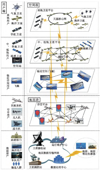 空间段是卫星物联网相比于传统物联网,在物理表现形式上的最大不同。空间段分布了位于大气层外不同轨道平面和高度的通信、导航、遥感等卫星以及位于大气层内邻近空间的飞艇等。这些卫星和飞艇上搭载了各类传感器和通信、路由等设备,形成互联互通的空间网络。