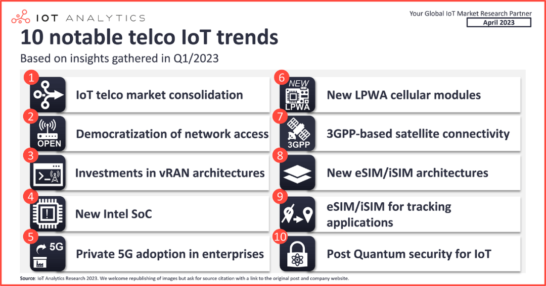 近日,物联网市场研究机构IoT Analytics结合2023年第一季度举办的世界移动通信大会(MWC)和嵌入式系统展(EW)两大国际性展会中物联网通信相关企业的重磅产品及亮相,以及对第一季度物联网通信企业的调研,形成了一份物联网通信市场趋势报告。