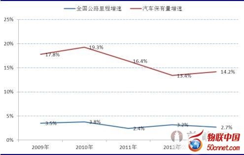2009-2013年我国汽车保有量及公路里程增速对比(单位:%)