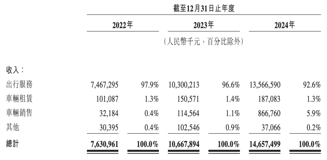 2022年至2024年,曹操出行来自出行服务的收入分别为74.67亿元、103亿元和135.67亿元,营收占比分别为97.9%、96.6%和92.6%;来自车辆租赁收入分别为1.01亿元、1.51亿元和1.87亿元;来自车辆销售的收入分别为3218万元、1.15亿元和8.67亿元。