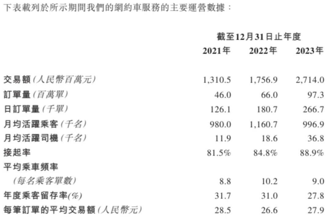 招股书显示,2021年-2023年,如祺出行网约车服务交易额从13.11亿元增长至27.14亿元,年复合增长率为43.9%;同期如祺出行网约车服务订单量从4600万单增长至9.97亿单,年复合增长率为45.4%。