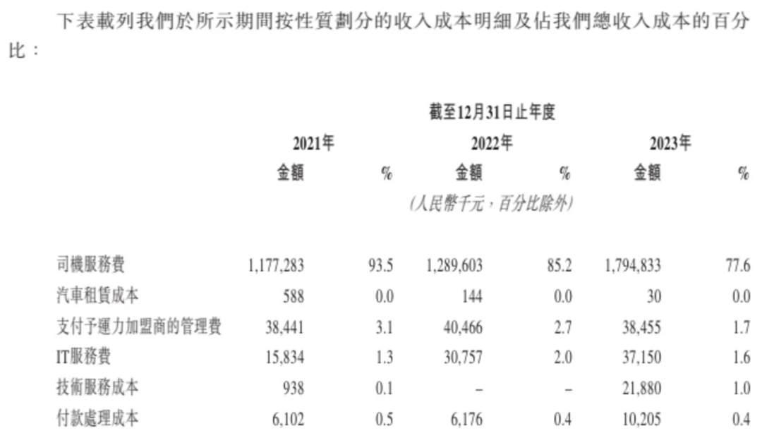 招股书显示,2021年-2023年,如祺出行司机服务费分别为11.77亿元、12.9亿元以及17.95亿元,司机服务费分别占各期收入成本的93.5%、85.2%以及77.6%。