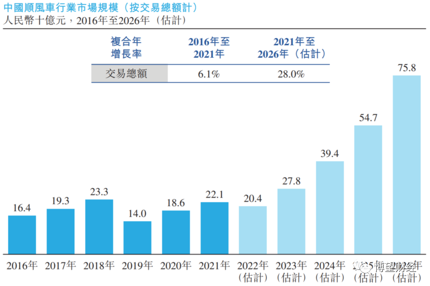 根据弗若斯特沙利文的数据,2021年中国汽车客运市场出租车扬招、出租车网约、网约车和顺风车的订单总数分别约为144亿、18亿、102亿和3亿,顺风车仅占1.1%,虽然随着顺风车出行距离的渗透率预计从2021年的0.25%增至2026年的0.65%,2026年中国顺风车市场的交易总额预计将达到758亿元,2021年至2026年的复合年增长率为28%,但占总盘子的比例仅7%。