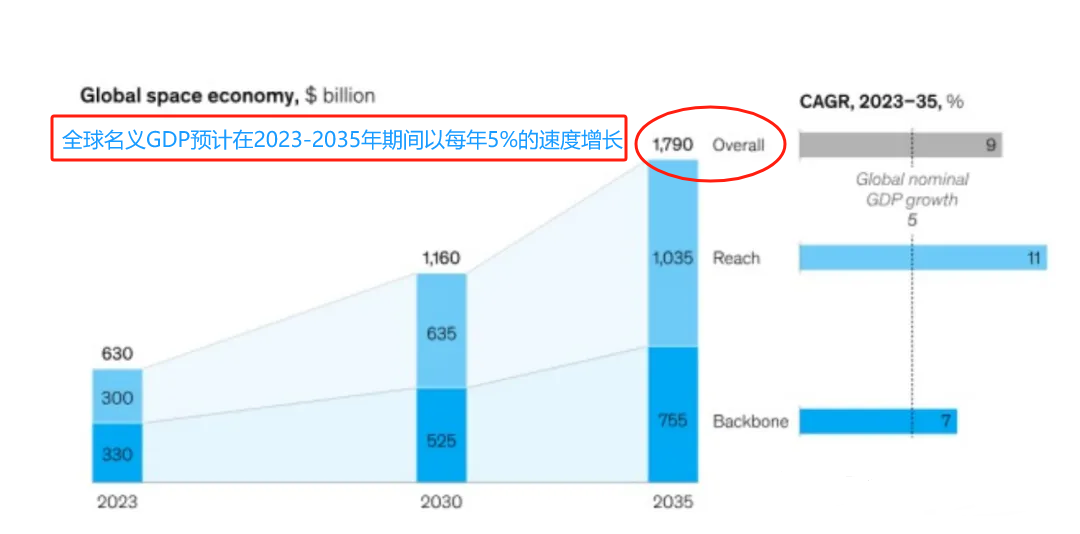 麦肯锡报告,预测到2035年全球太空经济的总量,将高达接近1.8万亿美元,相比2023年的6300亿美元,年平均增长率高达9%,成为未来十年拉动经济增长的重要引擎,这简直就是一个巨大的金矿。