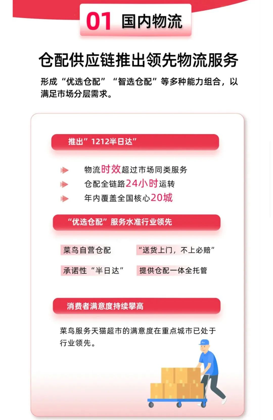 在主要面向商家的仓配供应链端,菜鸟搭建了供应链物流网络,包括7大仓储枢纽,仓储面积超过3000万平方米。此外,菜鸟还在今年推出“1212半日达”等服务,官方称仓配全链路实现了24小时运转、已经覆盖了全国20座核心城市。