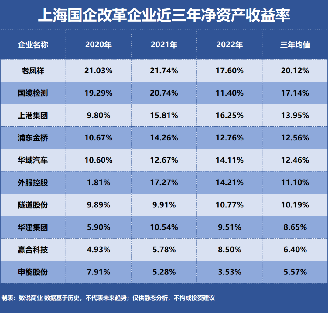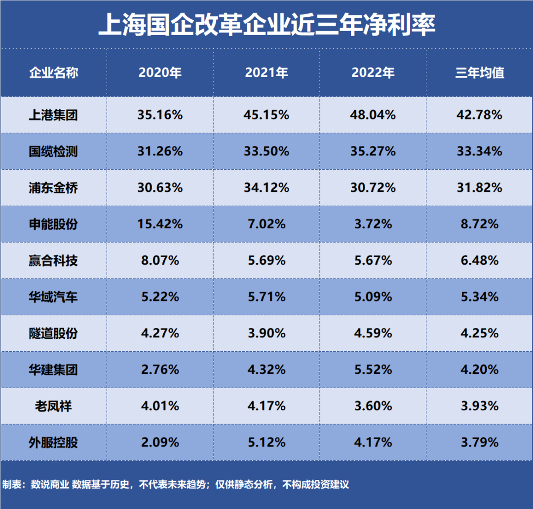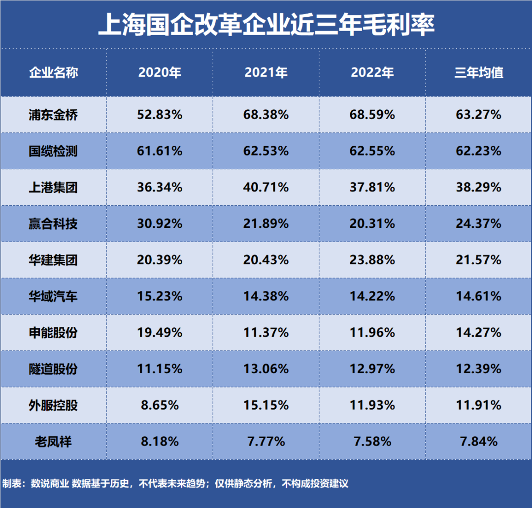 上海国企改革盈利能力前十企业,近三年净资产收益率、毛利率、净利率: