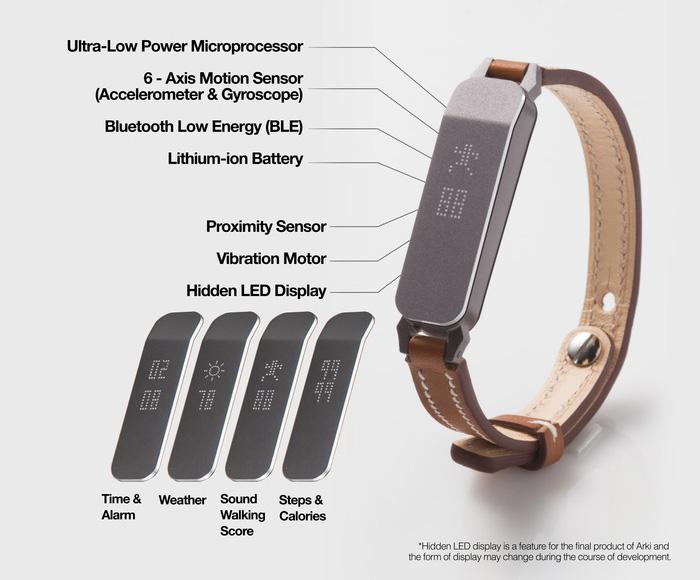 智能硬件新创公司Zikto推出的Arki是一款加强版的智能手环,它不仅拥有传统手环的健身追踪功能,还能够通过分析用户的走路姿势,为其提供相应的走路姿势的改善意见,进而改善用户的健康状况。Arki手环通过一项名为“身体平衡分析”的机器学习技术对佩戴者的肩膀、腰部和臀部弯曲的程度来做出测定,并且能够给出如何提高步行质量和纠正姿势的反馈。除此之外,这款健康手环也能提供其他同类产品所能提供的数据,包括行走步数、热量消耗和睡眠质量等。