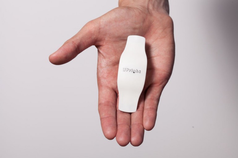 UpRight是一款体积较小的硅树脂棒,通过一块胶布贴在人体后腰,内置有加速计和专门设计的张力传感器,可测量脊柱的弯曲度,当用户的坐姿不正确时,它会发出振动提醒你。用户首次使用时,要端正坐姿对设备进行校正。张力传感器会感测设备的弯曲度,即脊椎的弯曲度,结合加速计中的数据后,UpRight能够对用户的坐姿进行反馈,通过振动提醒用户坐端正。该产品支持蓝牙4.0,能够将采集到的数据同步到手机应用中。在应用中,用户可以创建个人资料库,设计训练计划来摆除不良的坐姿,拉直背部肌肉形成健康良好的姿势。此外,UpRight内置可充电电池,充满电后的续航时间为4天左右。