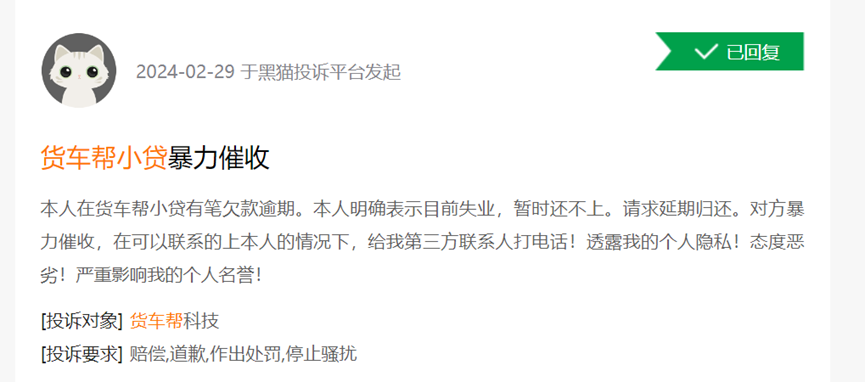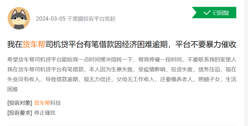 面对如此庞大群体,对非金融体系出身的满帮来说,合规管理是一个很大的挑战。黑猫平台上,涉及满帮及旗下“货车帮”的投诉,均超过2000条。其中,反映暴力催收、威胁恐吓、电话骚扰等问题,不在少数。