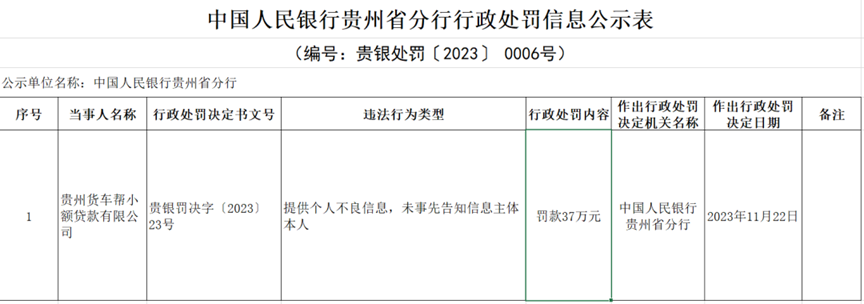 去年11月22日,因“提供个人不良信息,未事先告知信息主体本人”,人民银行贵州省分行对贵州货车帮小额贷款有限公司罚款37万元。