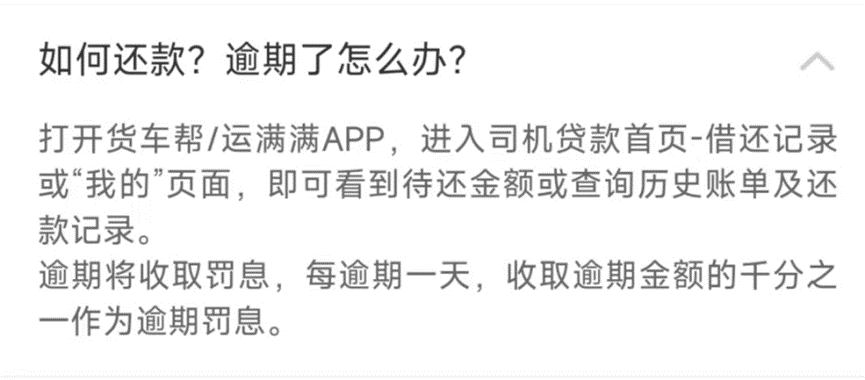 满帮旗下的贷款产品,有司机贷和司机白条等。以司机白条为例,货车帮司机APP显示,司机白条年利率21.96%起,每逾期一天,收取逾期金额的千分之一作为逾期罚息。如按日罚息千分之一计算,则年化利率达36.5%。