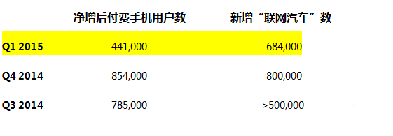 把前不久刚出的AT&T2015年Q1财报和2014年Q4、Q3两期对比,会发现一组有趣的数字:AT&T业务中,新增“联网汽车”数首次超过了付费手机用户数目。