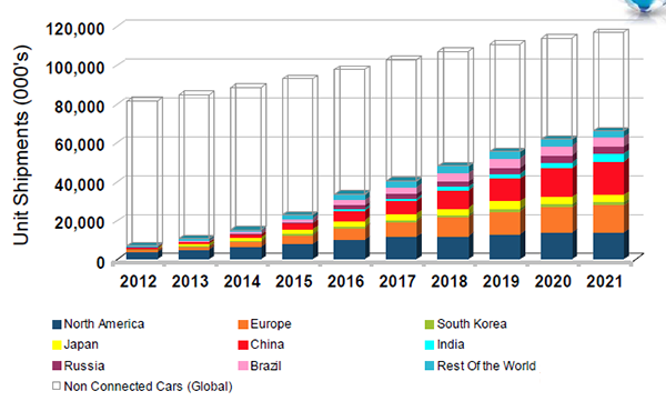 长期以来,和移动运营商对接车联网业务的,主要是B端主机厂。据美国咨询机构Strategy Analytics预测,世界前装车联网在近几年利好。欧美和中国市场的前装出货量增幅迅速。