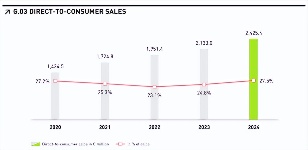 2024年,彪马批发业务按汇率调整后微增0.4%至63.92亿欧元,DTC业务增长16.6%至24.25亿欧元,相当于总销售额的27.5%,上一财年为24.8%。经汇率调整后,彪马自有全价门店和工厂直销点的销售额在2024年增长14.2%。