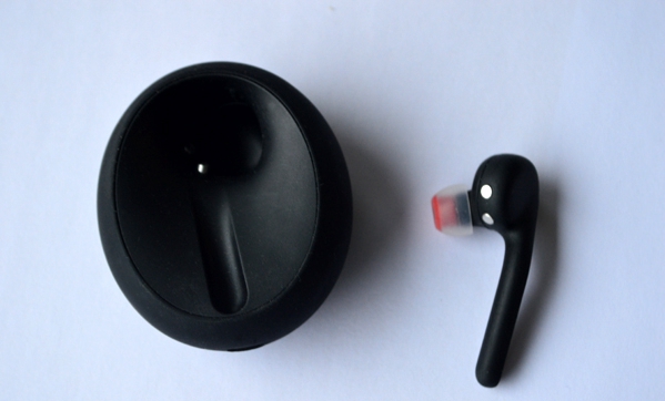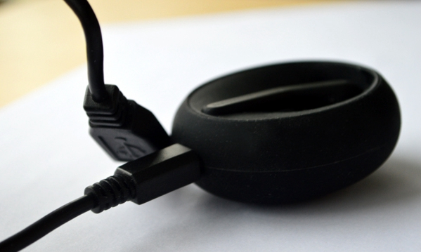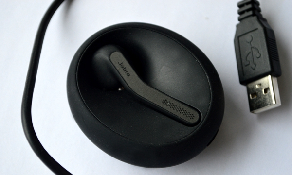 分离的便携充电底座和Jabra Eclipse 壹石蓝牙耳机,可以清晰看到用于充电金属触点。