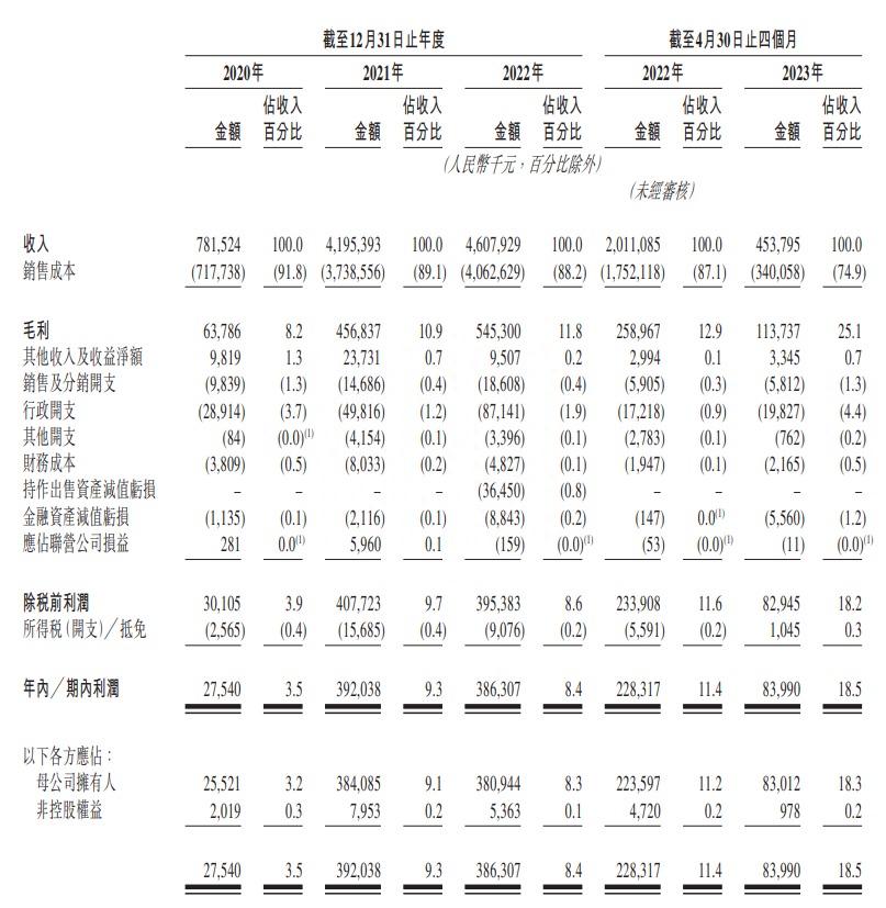 此外,乐舱物流的毛利也由2022年前四个月的2.59亿元下降至2023年同期的1.14亿元。不过,乐舱物流的毛利率有所优化,由2022年同期的12.9%增加至25.1%,主要是由于毛利率较高的船舶出租服务产生的收入比例增加。