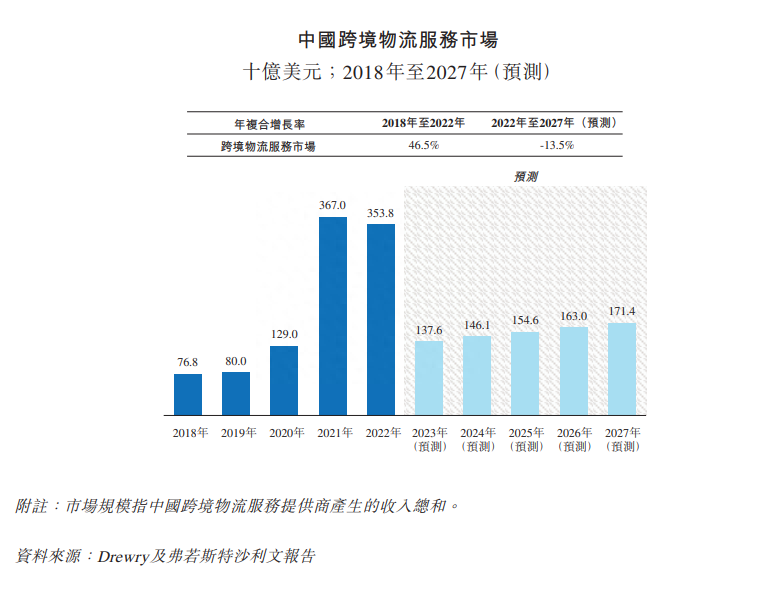 根据Drewry及弗若斯特沙利文报告,中国的跨境物流服务市场平稳增长。由于COVID-19爆发引起运力短缺及港口拥堵,导致2020年至2021年跨境物流服务运价大幅上涨,中国跨境物流服务市场于2021年规模大幅增至3670亿美元。