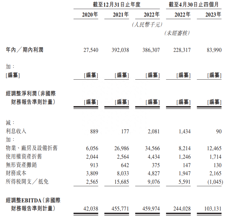 2020年.2021年和2022年,乐舱物流的营业收入分别为7.82亿元、41.95亿元和46.08亿元;年内利润分别为2754.0万元、3.92亿元和3.86亿元;非国际财务报告准则下经调整EBITDA分别为4203.8万元、4.56亿元和4.60亿元。