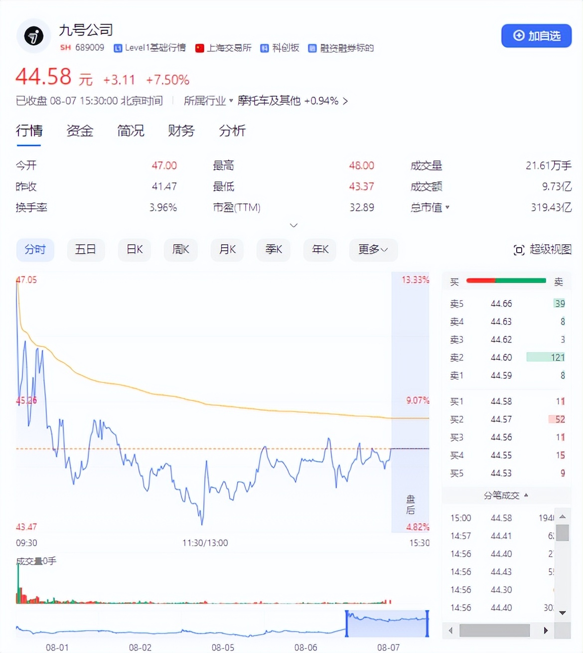 8月7日,九号公司股价大幅高开逾13%,截至收盘报44.58/股,总市值达到319.43亿。将时间拉回到8月6日晚,九号公司交上了一份亮眼成绩单,提振了市场信心。