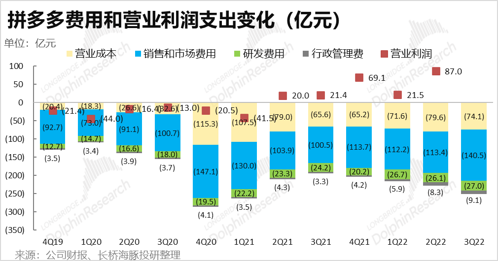 ②在竞争格局明显改善,公司业绩连续超预期后,拼多多领先加大费用投入合情合理,也能帮助公司继续抢占市场份额。首先,营销费用支出141亿元,较上季度和去年110亿左右的支出明显增长。9月上线的跨境电商平台Temu应当也是费用增长的原因之一。由于业绩持续爆炸,给与员工的激励和管理费用也暴炸式增长,环比继续增长10%(同比增长170%以上)。