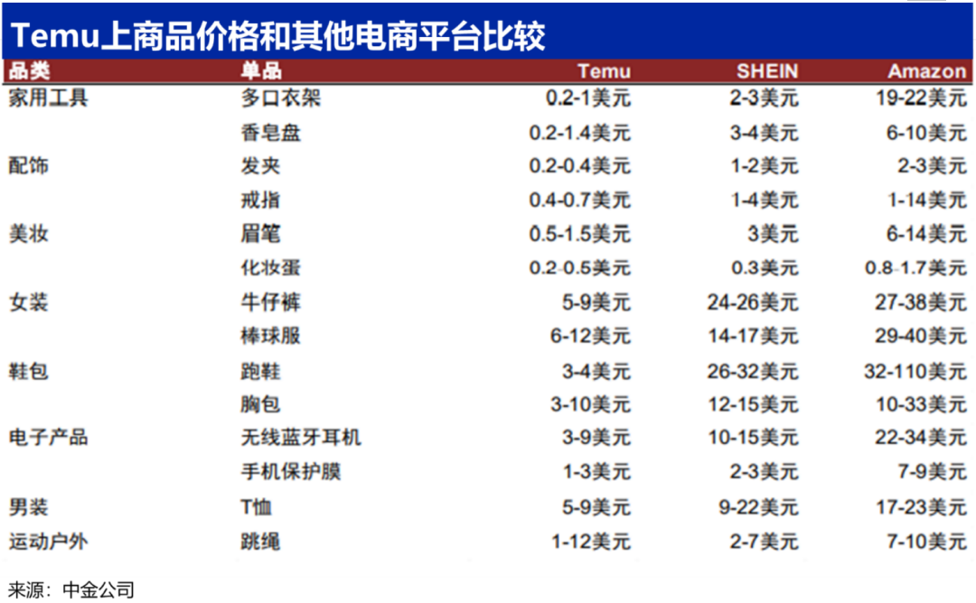 不过Temu和拼多多主站一样,同样以极致性价比为标签,根据中金的统计Temu平台上大量品类商品的客单价甚至不足1美元,全部商品单价基本也不会超过10美元。因此,Temu平台上单价商品的客单价大概率仅为个位数$。再剔除商品成本、和给予用户的折扣或运费减免后,公司最终获得的净收入大概率近乎为零,甚至目前可能还为负值。