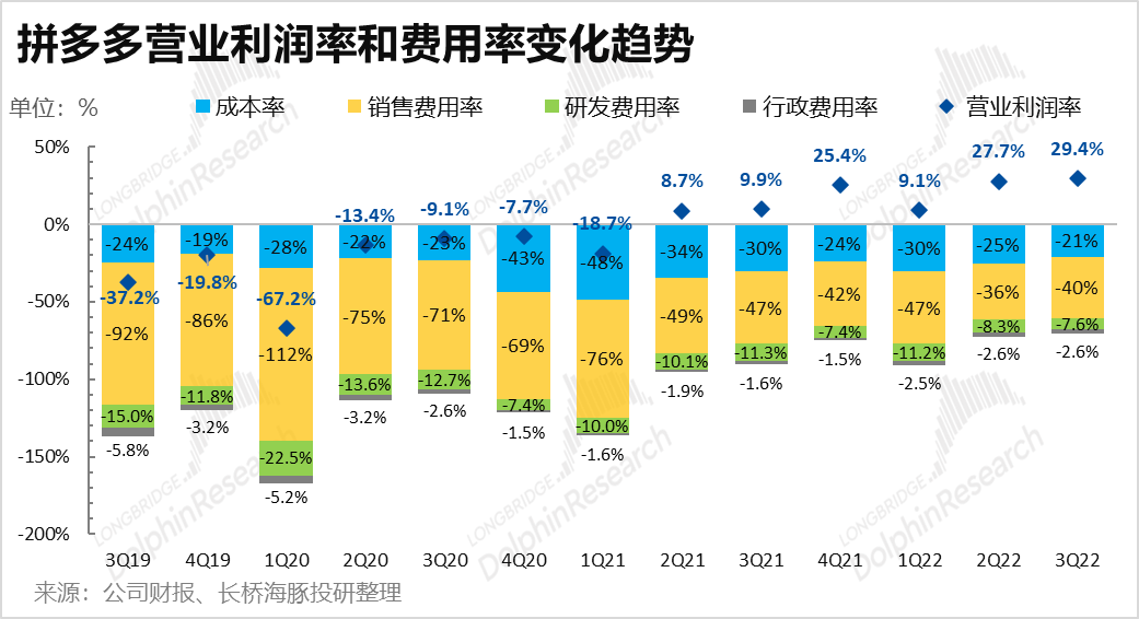 ①公司本季实现毛利润281亿元,远超卖方预期的225亿。毛利率也出乎意料的环比增加4.4pct到79%。虽然管理层一直声称毛利率提升是一次性利好,但海豚君认为从公司经营的角度,公司广告收入持续超预期表明变现率在持续提升。而变现率的增长并不会带来多少额外成本,这是毛利持续改善的主要驱动之一。另外,买菜业务的持续减亏应当是毛利持续改善的原因之二。