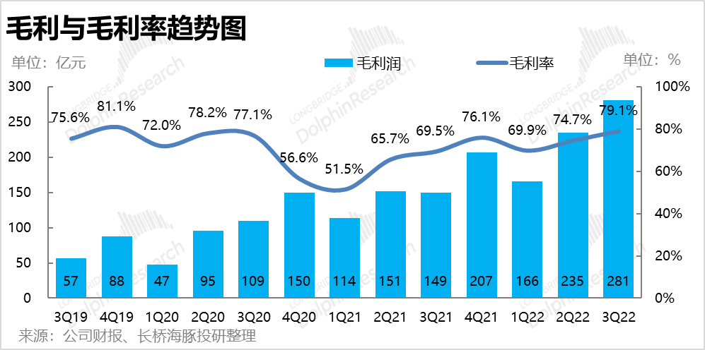 实际上,在竞争格局明显改善,公司业绩也连续超预期后,拼多多本季已再度加大了费用端投入(同行还在缩减),但由于毛利率持续大幅提升,公司最终的经营利润率还增长。首先从毛利角度,公司本季实现毛利润281亿元,远超卖方预期的225亿。本季毛利率也出乎意料的再度环比增加4.4pct到79%。