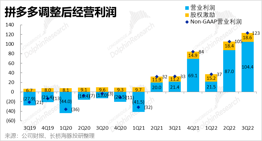 而在剔除了股权激励费用后,公司调整后的单季经营利润就来到了123亿元。无论营收还是利润都连续远远在市场预期之上,拼多多的表现只能说比牛更牛了。