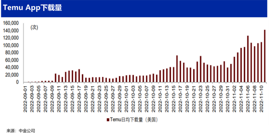 2)Temu的投入对拼多多整体的利润会有多少拖累。就第一点的起量速度,Temu目前在美国购物类App中的下载量排名已经做到第一。由下图可见,自11月以来,Temu的单日下载量已在10万以上。而据新闻媒体报导,Temu的日均GMV规模近期已达到150万美元。简单换算,Temu四季度的GMV规模大概率会在1亿美元以上。