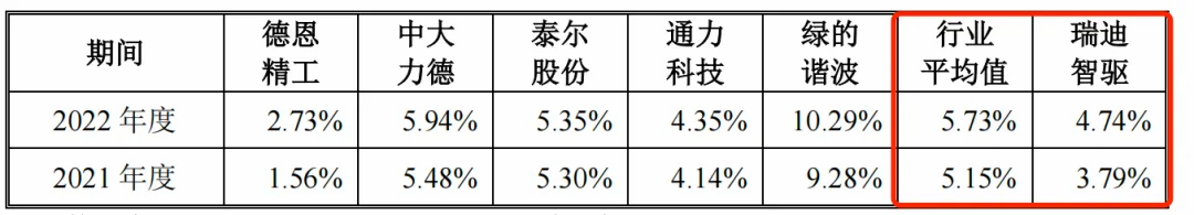 招股书显示,2021-2023年,瑞迪智驱的研发费用分别为2147.95万元、2785.41万元、3298.11万元;研发费用占营业收入的比例分别为3.79%、4.74%和5.64%。而2021年、2022年,同行公司研发费用率行业平均值分别为5.15%、5.73%,均高于瑞迪智驱。