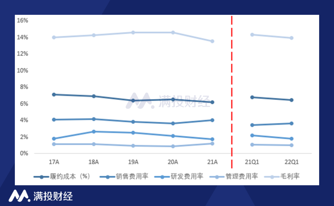 再考察公司成本端变化,履约成本构成除营业成本外公司的最大支出,包括履约中心、客服中心及实体店产生的人员成本、仓储、第三方物流成本等。公司费用率基本稳定,2020年起销售费用率、管理费用率稍有上升,在2022Q1费用增速达到24.4%、11.2%,前者高于收入增速(18%)。集团整体2021年毛利率为13.56%,同比略有下降,主要原因为公司大力发展低毛利新业务所致。
