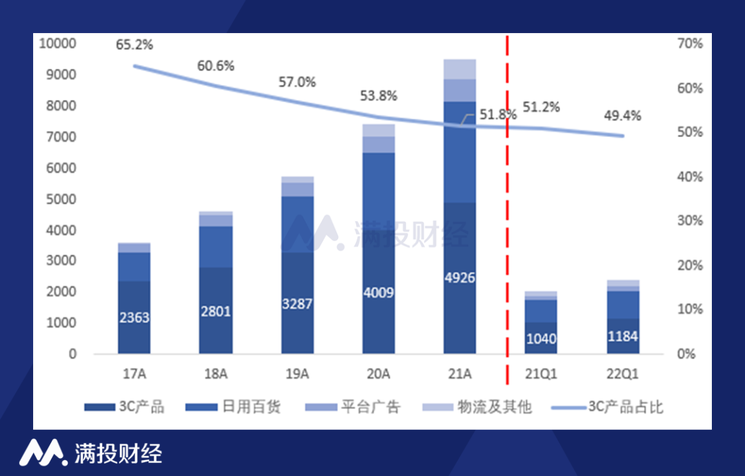 从产品品类上来看,京东集团2022Q1商品收入录得2044.2亿元人民币,总收入占比达85.3%,其中3C产品收入占比不断下降,一季度营收1183.7亿元,占比仅为49.4%,历史上首次占比不及50%;而在服务收入方面,平台广告、“物流及其他”服务分别录得176.8亿、175.6亿,收入占比为7.4%、7.3%,目前二者各占服务收入半壁江山,由于物流业务营收增速不减,公司服务收入结构未来可能改变,零售数据显示京东作为电商平台巨头从垂直3C领域向全品类发展的趋势不变。