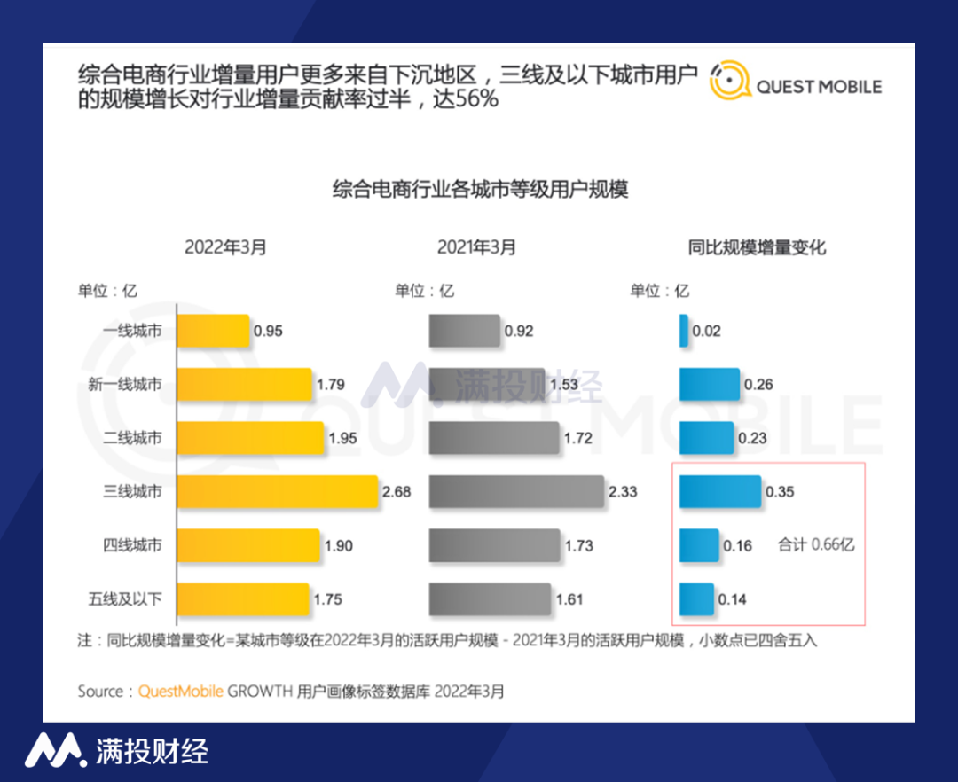 新业务为京东带来了不少的流量,是未来下沉用户的主要增量来源。2019下半年开始,公司开启京喜业务线,正式加码下沉市场,活跃买家数出现明显反弹。据统计,京东2021年度活跃用户数同比增长16.2%,新增近1亿用户,其中70%来自下沉市场;而截至2022Q1,年度活跃用户数达5.81亿,2022年一季度新增1080万人的中,有51.0%来自下沉市场。