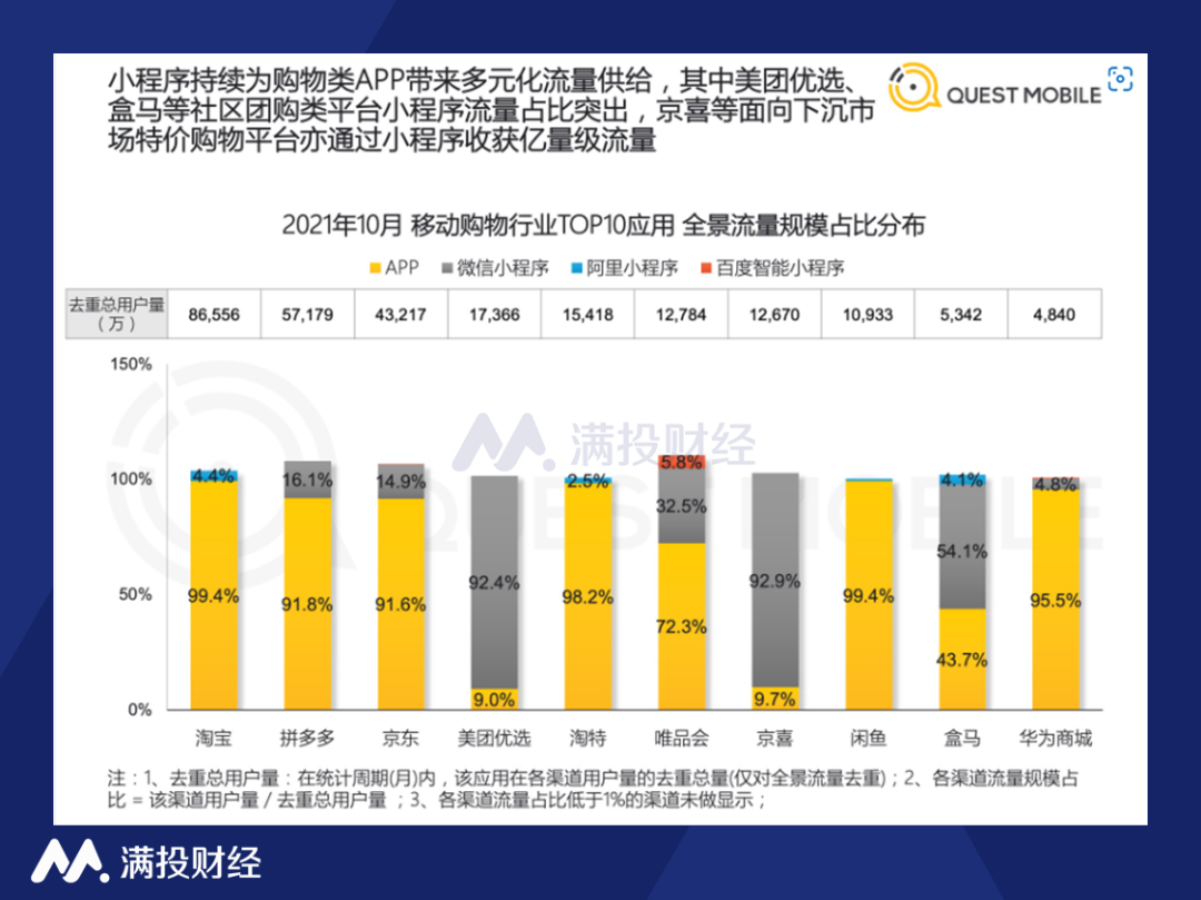 2015年10月,京东继续深化与腾讯的战略合作关系,并支付在通信、广告和会员服务相关领域费用共计8亿美元,对此公司受益流量扶持的效果是十分明显的。据去年10月QM数据显示,“京喜”APP近93%的去重用户量来自微信小程序的导流,自身APP仅占9.7%(存在多渠道用户),即使公司核心电商平台“京东”APP也有近15%用户来自微信。