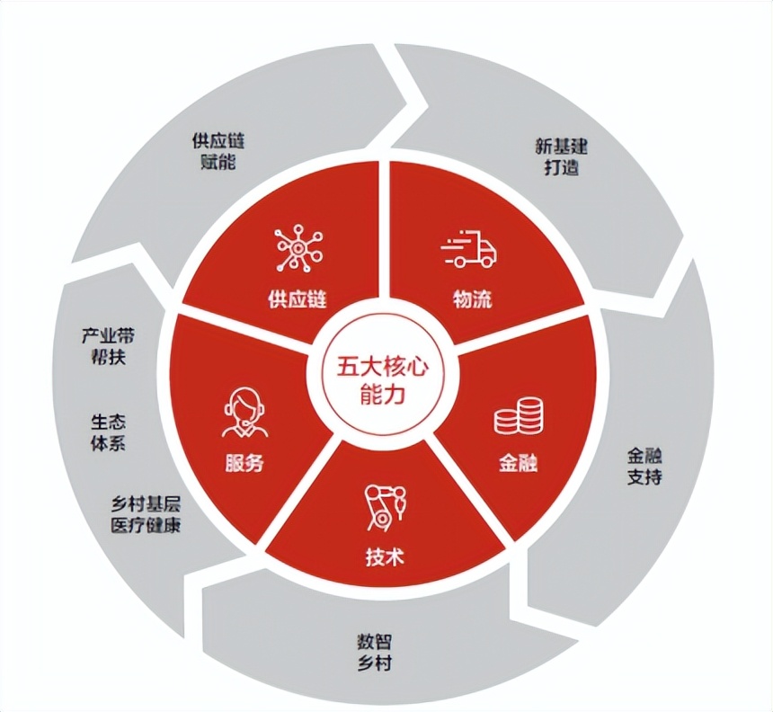 京东的加入,刷新了“产业扶贫”和“产业振兴”的含义。京东不像传统做法那样去乡村组织生产,而是为乡村产业提供平台。具体而言,京东对农村的投入,涉及下图中的这五大核心能力。