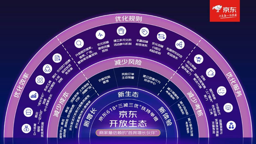 京东在618活动中,为商家准备了30项“三减三优”政策——既减少成本、减少考核、减少风险、优化规则、优化效率、优化服务(具体见下图)。京东借由智能化的平台服务,尽可能为卖家降低经营成本。