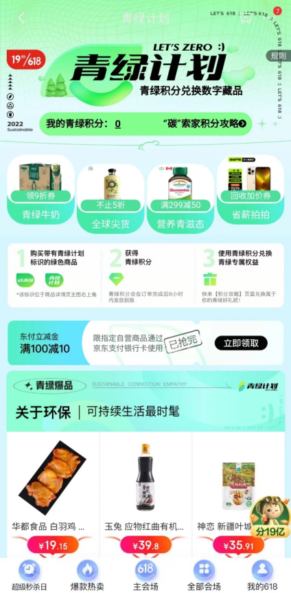 京东通过智能推荐引导绿色消费。618期间,消费者购买绿色商品,不仅可以享受到更多优惠福利,而且还可通过积分兑换商品或参与互动。