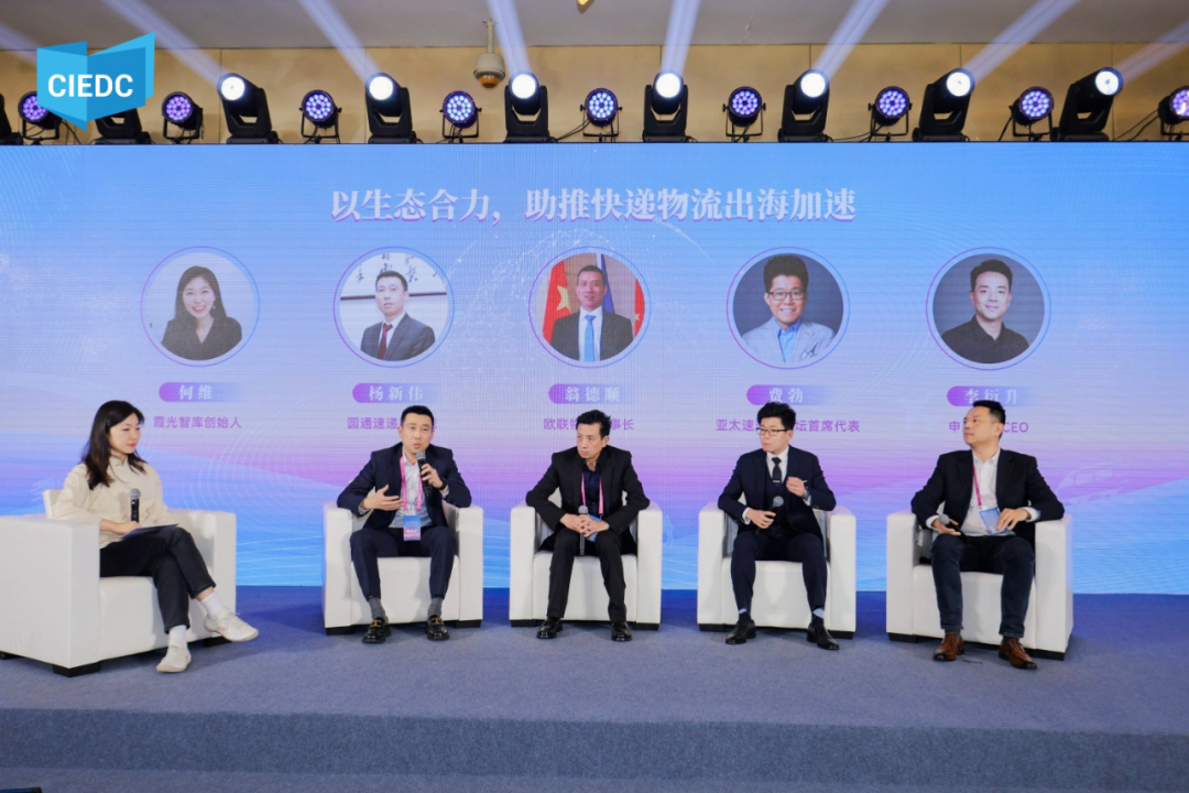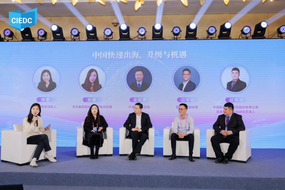 菜鸟集团国际公共事务总经理房漪、中通速递副总裁金任群、极兔速递副总裁后军仪、中国邮政速递物流股份有限公司发展规划部行业研究负责人赵洪涛,参与论坛圆桌话题讨论。