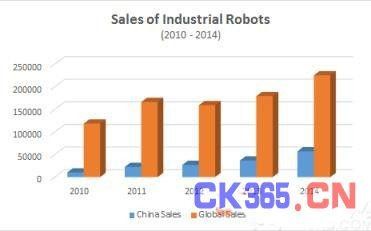在过去的几年中,全球工业机器人产业经历了强劲发展。根据国际机器人联合会数据显示,工业机器人的全球销售量在2014年达到230000台,并在2015年预计将增长15%。发达国家制造商如美国,日本和欧洲以先进的核心技术和完善的品牌引领工业机器人行业。