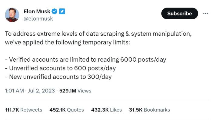 2023年7月,马斯克发文称,为了解决极端水平的数据抓取和系统操纵问题,Twitter已采取了临时限制:认证帐户每天可阅读6000个帖子,未认证的老帐户可阅读600个帖子,未认证的新帐户每天可阅读300个帖子。